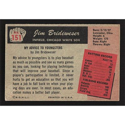 This is a 1955 Bowman Jim Brideweser baseball card. The card is #151 and pictures show condition.