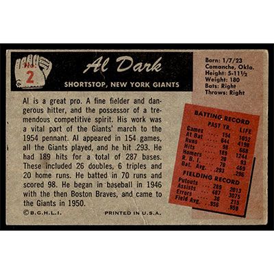 This is a 1955 Bowman Al Dark baseball card. The card is #2 and pictures show condition.