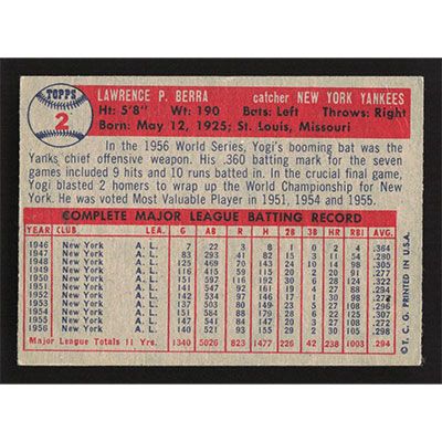 This is a 1957 Topps Yogi Berra baseball card. The card is #2 and pictures show condition.