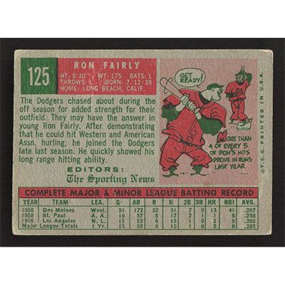 This is a 1959 Topps Ron Fairly Rookie Stars baseball card. The card is #125 and pictures show condition. Team(s): Los Angeles Dodgers Rookie Card (RC)