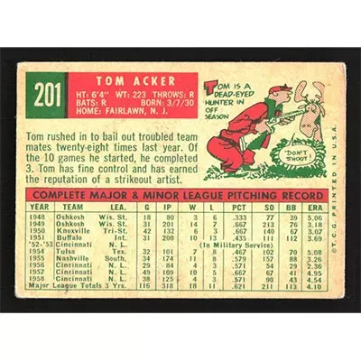 This is a 1959 Topps Tom Acker baseball card. The card is #201 and pictures show condition.