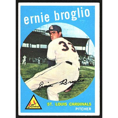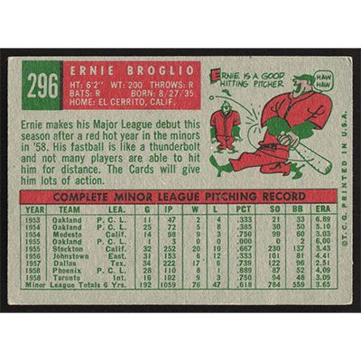 This is a 1959 Topps Ernie Broglio baseball card. The card is #296 and pictures show condition.