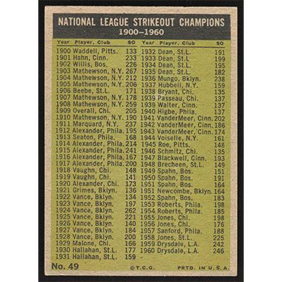 This is a 1961 Topps Don Drysdale, Sandy Koufax, Sam Jones and Ernie Broglio League Leaders baseball card. The card is #49 and pictures show condition.