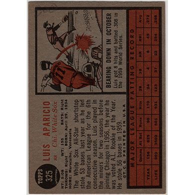 This is a 1962 Topps Luis Aparicio baseball card. The card is #325. Please use pictures to judge condition.