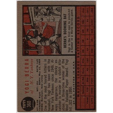 This is a 1962 Topps Yogi Berra baseball card. The card is #360. Please use the photos to judge condition.