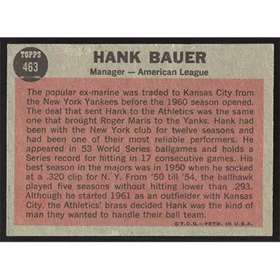 This is a 1962 Topps Hank Bauer baseball card. The card is #463 and pictures show condition.