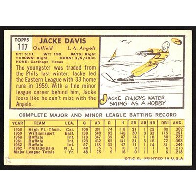 This is a 1963 Topps Jacke Davis baseball card. The card is #117 and pictures show condition.