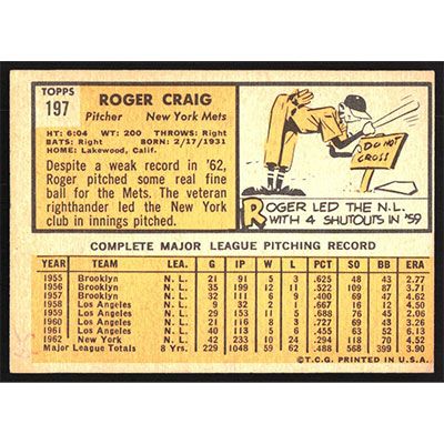This is a 1963 Topps Roger Craig baseball card. The card is #197 and pictures show condition.