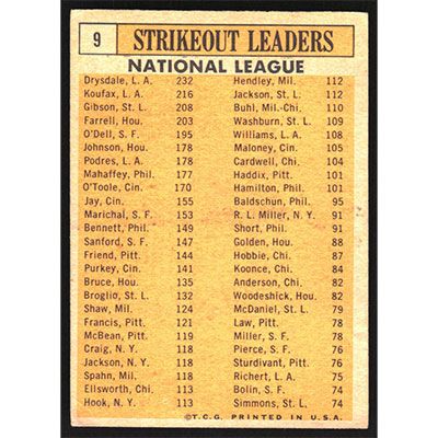 This is a 1963 Topps Don Drysdale, Sandy Koufax, Bob Gibson, Dick Farrell and Billy O'Dell League Leaders baseball card. The card is #9 and pictures show condition.