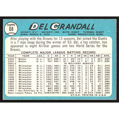 This is a 1965 Topps Del Crandall baseball card. The card is #68 and pictures show condition.