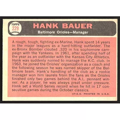 This is a 1966 Topps Hank Bauer baseball card. The card is #229 and pictures show condition.