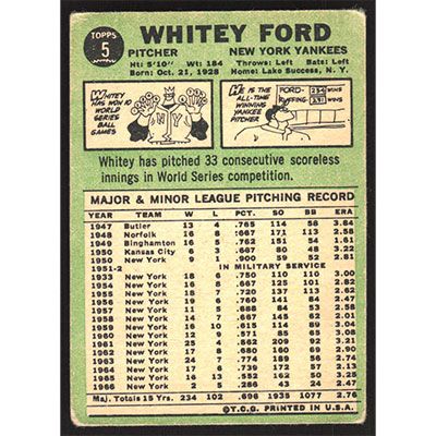 This is a 1967 Topps Whitey Ford baseball card. The card is #5 and pictures show condition.