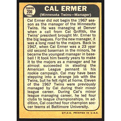 This is a 1968 Topps Cal Ermer baseball card. The card is #206 and pictures show condition.