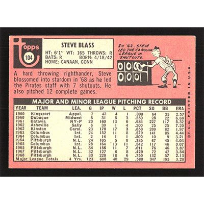 This is a 1969 Topps Steve Blass autographed baseball card. This card has been signed, in blue, by Steve Blass, and is guaranteed authentic by Ballcardz.com. The card is #104 and pictures show condition.