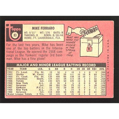 This is a 1969 Topps Mike Ferraro baseball card. The card is #83 and pictures show condition.