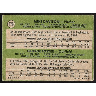 This is a 1971 Topps Mike Davison and George Foster Rookie Stars baseball card. The card is #276 and pictures show condition. Team(s): San Francisco Giants Rookie Card (RC)