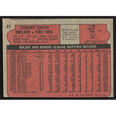 This is a 1972 Topps Tommy Davis baseball card. The card is #41 and pictures show condition.