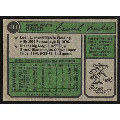This is a 1974 Topps Frank Baker baseball card. The card is #411 and pictures show condition.