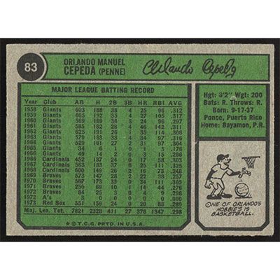 This is a 1974 Topps Orlando Cepeda baseball card. The card is #83 and pictures show condition.