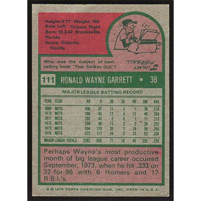 This is a 1975 Topps Wayne Garrett baseball card. The card is #111 and pictures show condition.