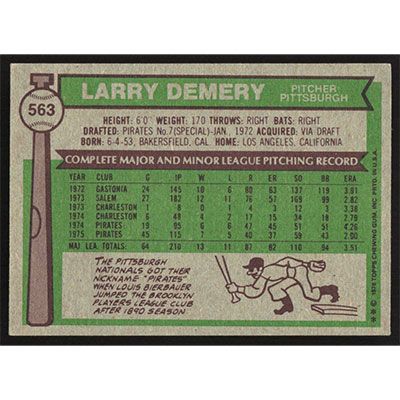 This is a 1976 Topps 2016 65th Anniversary Buybacks Red Foil Larry Demery baseball card. The card is #563 and pictures show condition. Team(s): Pittsburgh Pirates