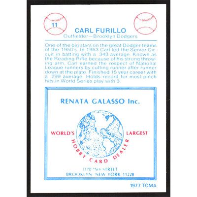 This is a 1977 Galasso Glossy Greats Carl Furillo baseball card. The card is #11 and pictures show condition.