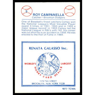This is a 1977 Galasso Glossy Greats Roy Campanella baseball card. The card is #5 and pictures show condition.