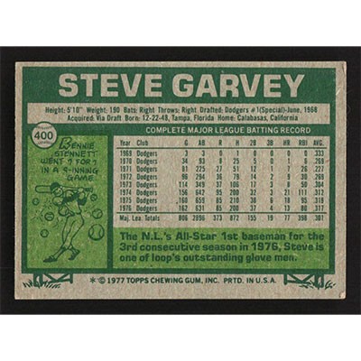 This is a 1977 Topps Steve Garvey baseball card. The card is #400 and pictures show condition.