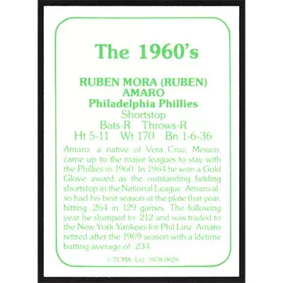 This is a 1978 TCMA '60's I Ruben Amaro baseball card. The card is #28 and pictures show condition.