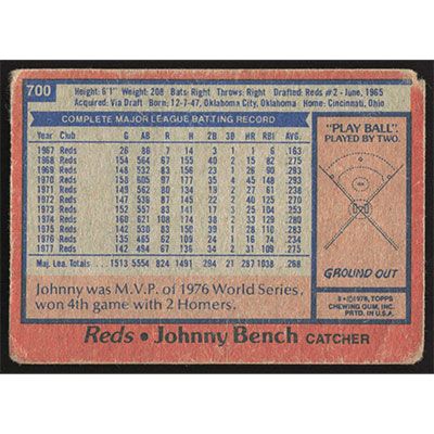 This is a 1978 Topps Johnny Bench baseball card. The card is #700 and pictures show condition.