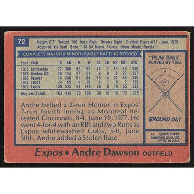 This is a 1978 Topps Andre Dawson baseball card. The card is #78 and pictures show condition.