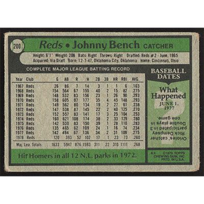 This is a 1979 Topps Johnny Bench baseball card. The card is #200 and pictures show condition.