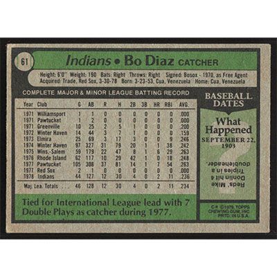 This is a 1979 Topps Bo Diaz baseball card. The card is #61 and pictures show condition.
