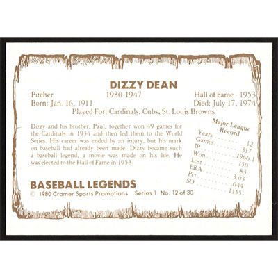 This is a 1980 Cramer Baseball Legends Series 1 Dizzy Dean baseball card. The card is #12 and pictures show condition.