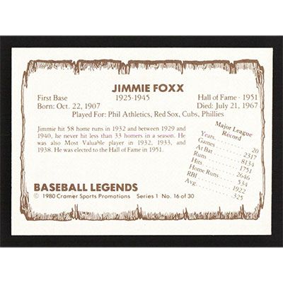 This is a 1980 Pacific Legends Jimmie Foxx baseball card. The card is #16 and pictures show condition.