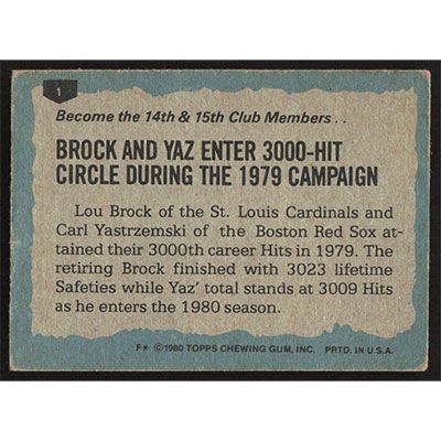 This is a 1980 Topps Lou Brock and Carl Yastrzemski Highlights baseball card. The card is #1 and pictures show condition. Team(s): St. Louis Cardinals/Boston Red Sox