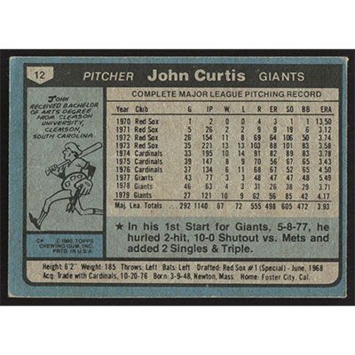 This is a 1980 Topps John Curtis baseball card. The card is #12 and pictures show condition.