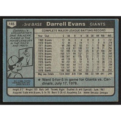 This is a 1980 Topps Darrell Evans baseball card. The card is #145 and pictures show condition.