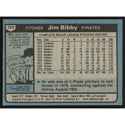 This is a 1980 Topps Jim Bibby baseball card. The card is #229 and pictures show condition.