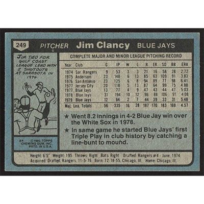 This is a 1980 Topps Jim Clancy baseball card. The card is #249 and pictures show condition.