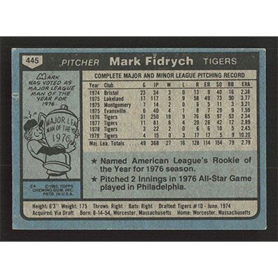 This is a 1980 Topps Mark Fidrych baseball card. The card is #445 and pictures show condition.