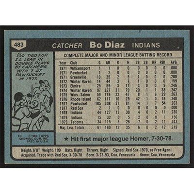 This is a 1980 Topps Bo Diaz baseball card. The card is #483 and pictures show condition.