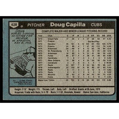 This is a 1980 Topps Doug Capilla baseball card. The card is #628 and pictures show condition.