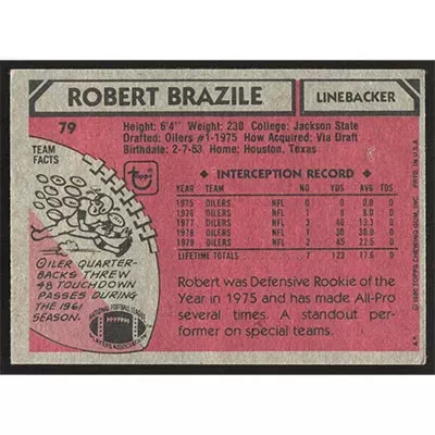 This is a 1980 Topps Robert Brazile football card. The card is #79 and pictures show condition.