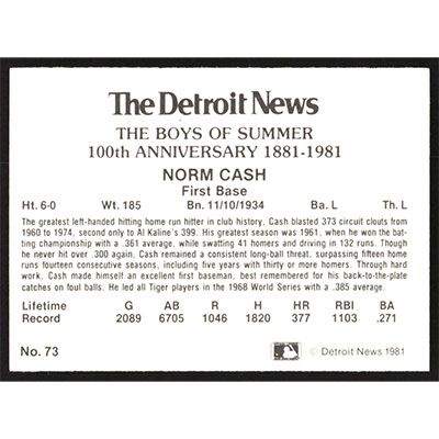 This is a 1981 Detroit News Tigers Norm Cash baseball card. The card is #73 and pictures show condition.