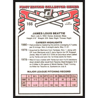 This is a 1981 Donruss Jim Beattie baseball card. The card is #166 and pictures show condition.