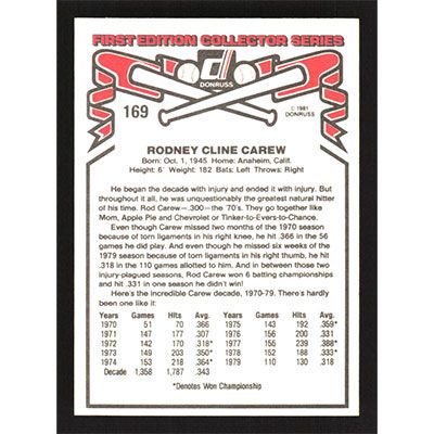 This is a 1981 Donruss Rod Carew baseball card. The card is #169 and pictures show condition.