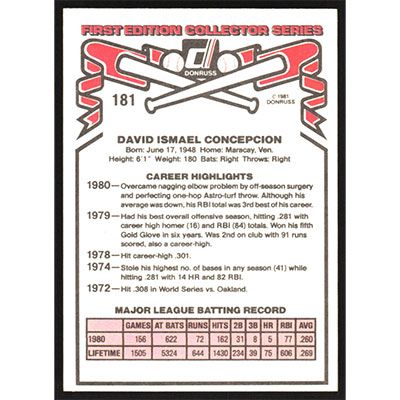 This is a 1981 Donruss Dave Concepcion baseball card. The card is #181 and pictures show condition.