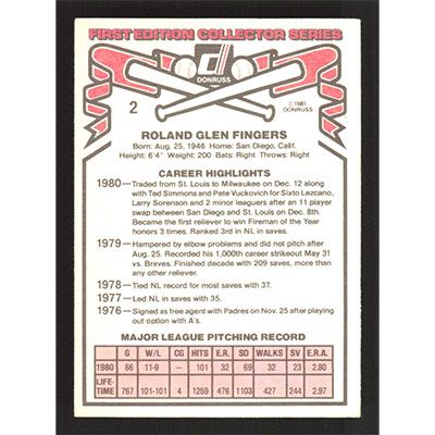 This is a 1981 Donruss Rollie Fingers baseball card. The card is #2 and pictures show condition.