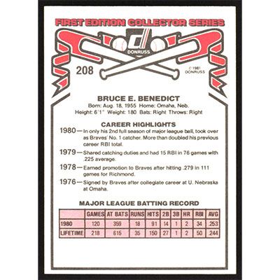 This is a 1981 Donruss Bruce Benedict baseball card. The card is #208 and pictures show condition.